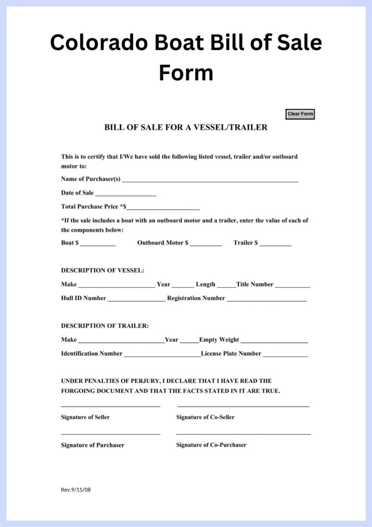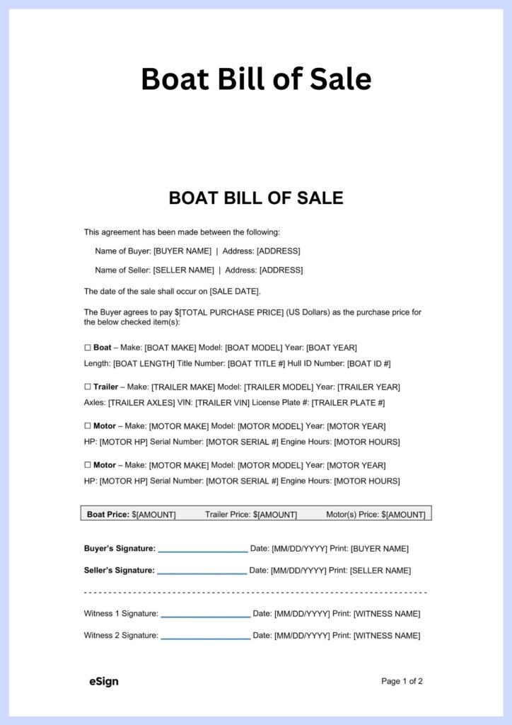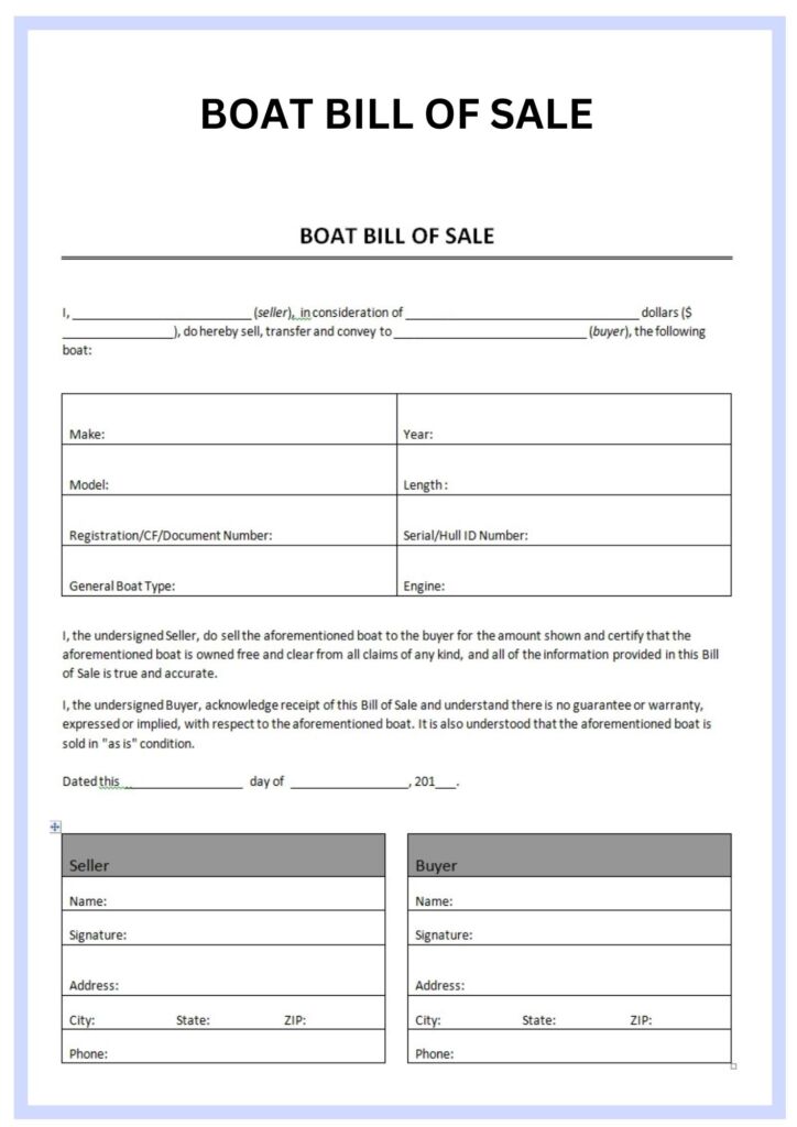A bill of sale document is necessary as evidence of a transaction. The bill of sale ought to comprise particulars such as the exterior hull identification code (HIN), color of the boat, date of acquisition, and the cost.
